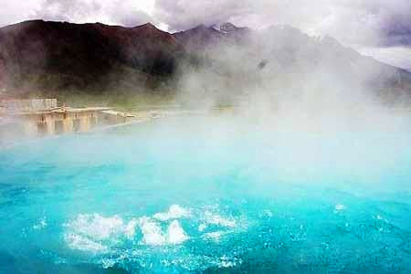在世界屋脊上,有一座給高原古城拉薩帶來光明與希望的新興城鎮,這就是羊八井。它位于青藏公路和中國通往尼泊爾公路的交叉點上,是西藏第一個地熱開發試驗區,已建有熱電站、地熱溫室和溫泉浴室。它所處的羌塘草原是個高寒地區,一年有八、九個月冰封土凍。然而方圓40平方公里的熱田,卻綠草如茵,青稞垛金燦燦,溫泉的霧氣騰騰。要是往滾滾向上冒的溫泉邊放上幾只雞蛋,三五分鐘便可煮熟。